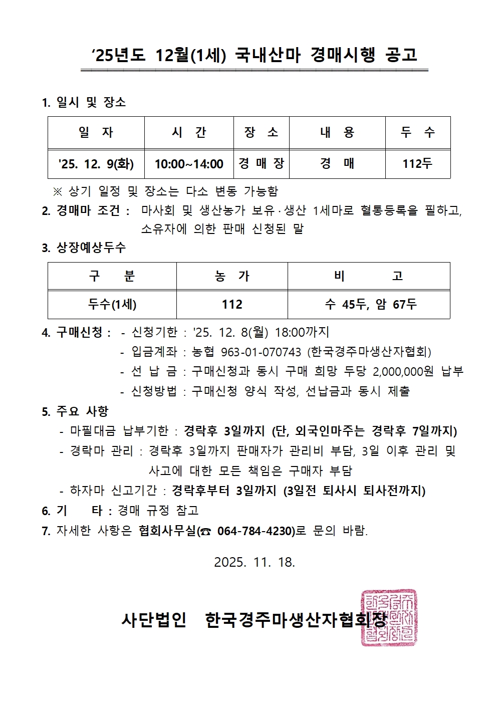 '25년 11월 1세마 경매 공지사항 알림